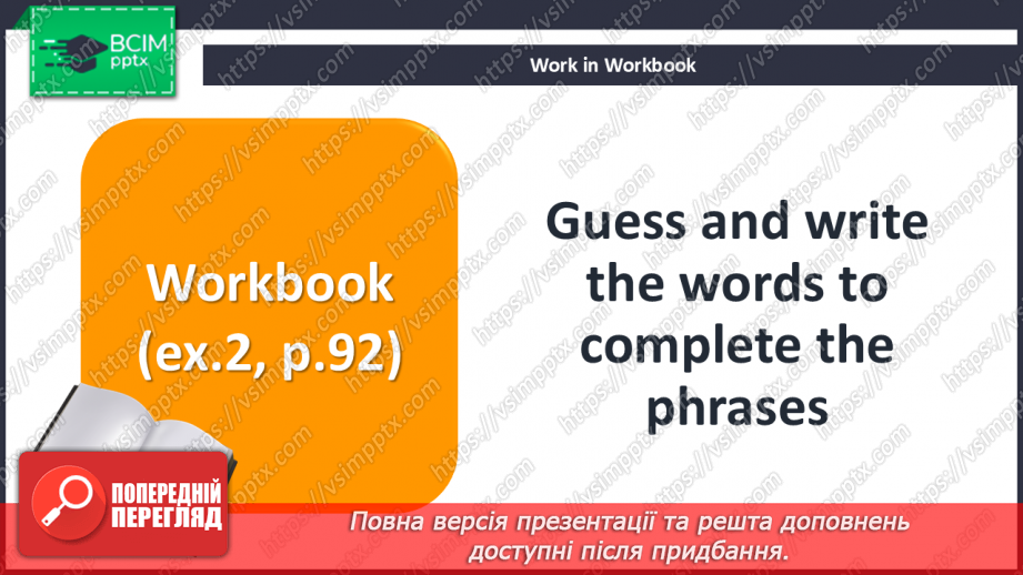 Slide 20-21. Work in Workbook. Guess and write the words to complete the phrases (ex.2, p.92)