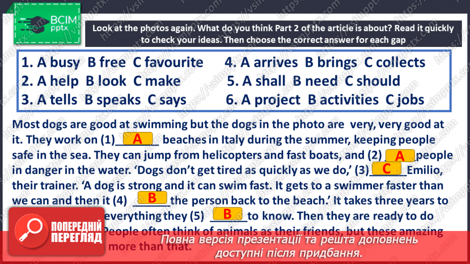 Slide 11-13. Work with Student’s Book. Look at the photos again. What do you think Part 2 of the article is about? Read it quickly to check your ideas. Then choose the correct answer for each gap (ex.3, p.92)